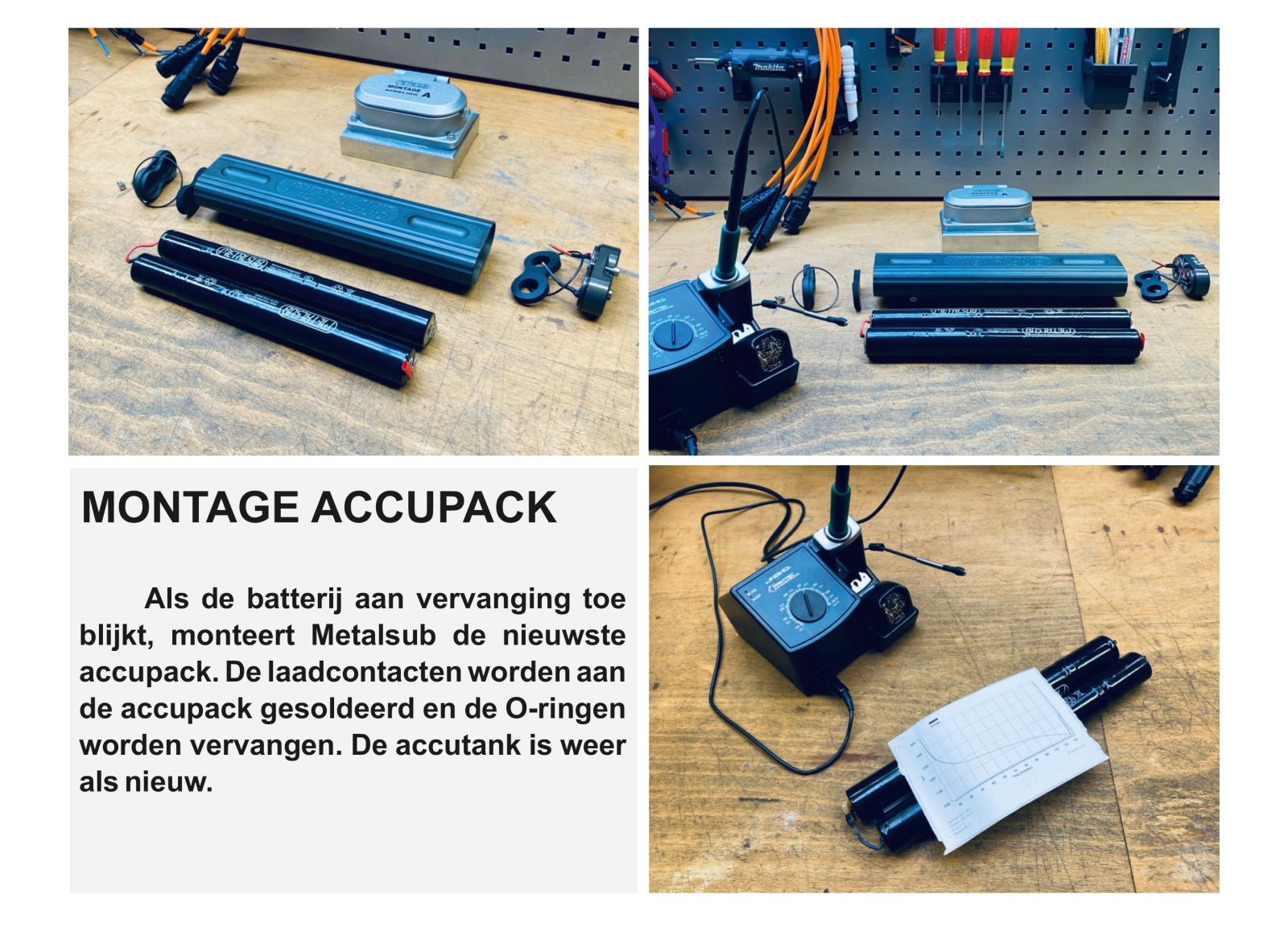 De producten van Metalsub zijn zo ontworpen dat ze een levenlang meegaan. Na regelmatig gebruik en het verstrijken van de tijd, kan de batterij aan vervanging toe zijn. Metalsub heeft alle apparatuur in huis om de accutanks en duiklampen weer in perfecte staat te krijgen.